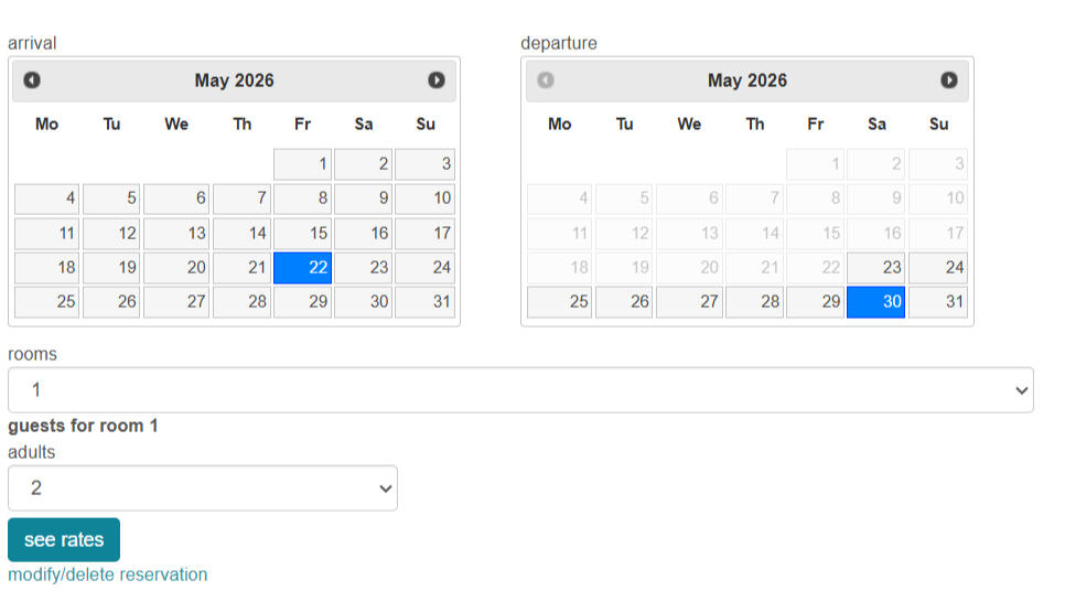 DIRECTIONS: Pressing on the diary or the button you are transfered in a new page to check availabilty and prices. Once you choose your dates you can book your stay and you will receive an email to pay 30% advance payment via bank deposit or STRIPE secure enviroment by card.